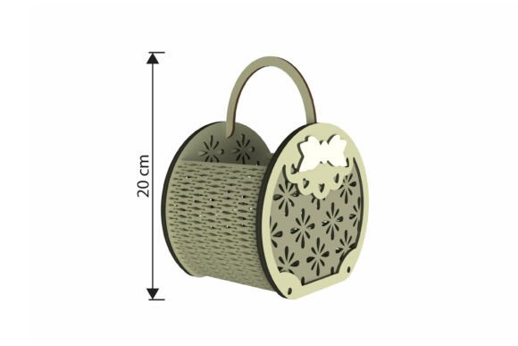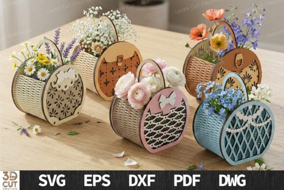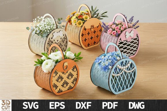 Cada diseño presenta una cesta circular con asa integrada, acompañada de patrones decorativos tipo floral o geométrico, creando un estilo moderno que luce espectacular cuando se fabrica en MDF, madera natural o acrílico pintado.