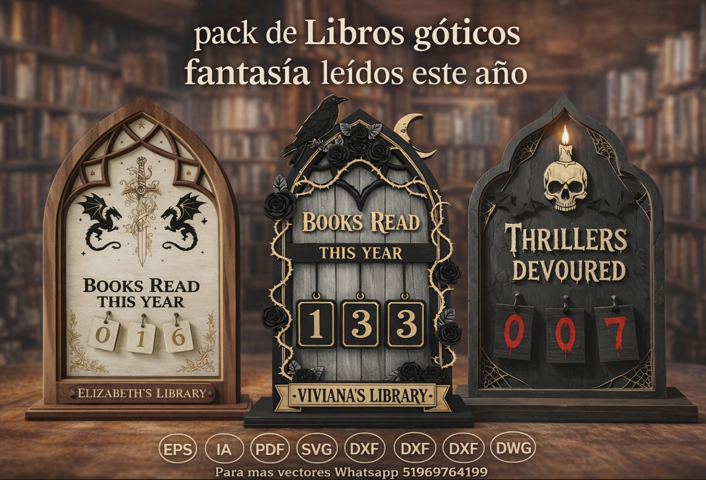 Pack de contador de libros leídos para corte láser con estilo gótico y fantasía, incluye 3 diseños decorativos con números colgantes para registrar libros leídos durante el año, ideales para fabricar decoración literaria en madera para bibliotecas personales.