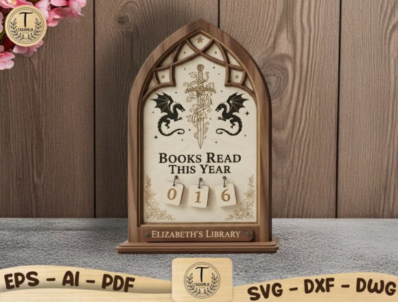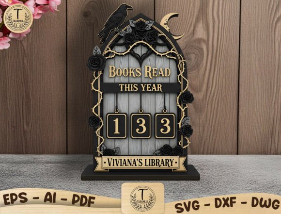 Cada diseño funciona como un contador decorativo de libros leídos durante el año, utilizando números colgantes intercambiables que permiten actualizar fácilmente la cantidad de libros. Su estética combina arquitectura gótica, símbolos literarios y elementos oscuros de fantasía, creando una pieza única para bibliotecas personales.