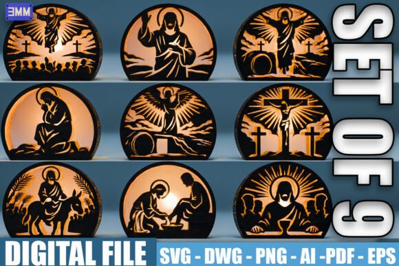 El pack incluye 9 composiciones cristianas iluminadas, cada una representando escenas y símbolos de la fe.