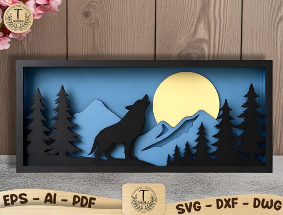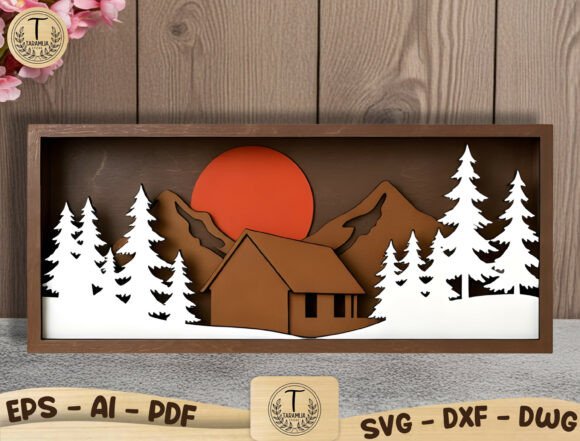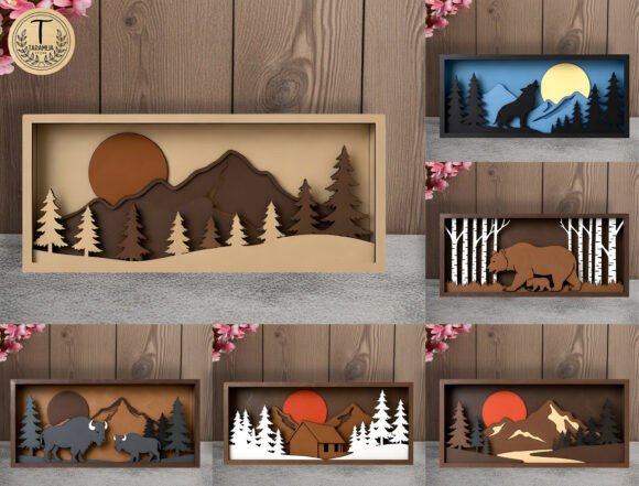 Cada cuadro utiliza capas superpuestas de madera para representar diferentes elementos del paisaje: montañas, árboles, animales silvestres, cabañas y cielos con sol o luna. El resultado es una pieza decorativa moderna que juega con sombras, contraste de tonos y volumen, ideal para decoración del hogar.