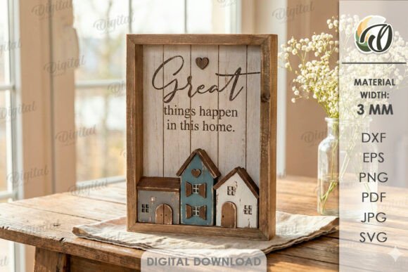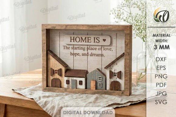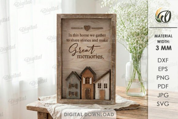 Cada diseño combina marcos tipo caja con pequeñas casas en relieve, formando escenas que evocan barrios tranquilos y hogares llenos de vida. Las composiciones incluyen frases inspiradoras sobre el hogar, la familia y los recuerdos, creando decoraciones perfectas para salas, entradas o espacios familiares.