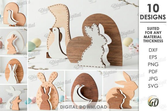 El pack incluye 10 decoraciones de Pascua con siluetas en capas, cada una con un estilo diferente inspirado en la naturaleza y los símbolos tradicionales de la temporada.
