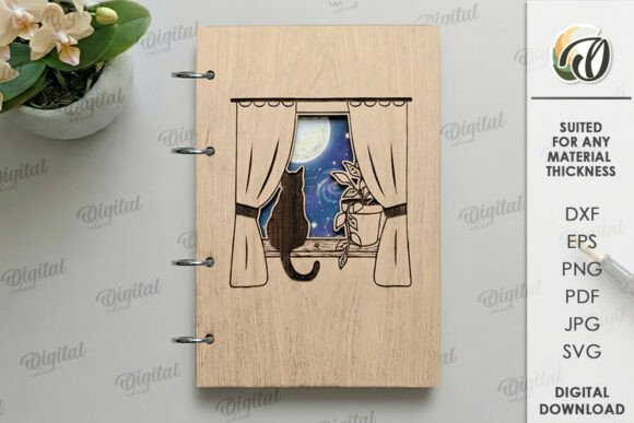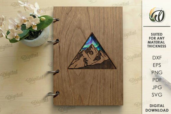 Archivos en SVG, DXF, PNG, PDF y EPS, compatibles con LightBurn, CorelDRAW, Illustrator y máquinas CNC de corte láser. Diseños perfectos para crear cuadernos personalizados, portadas de libreta en madera, álbumes artesanales, libretas creativas y productos de papelería artesanal para venta.