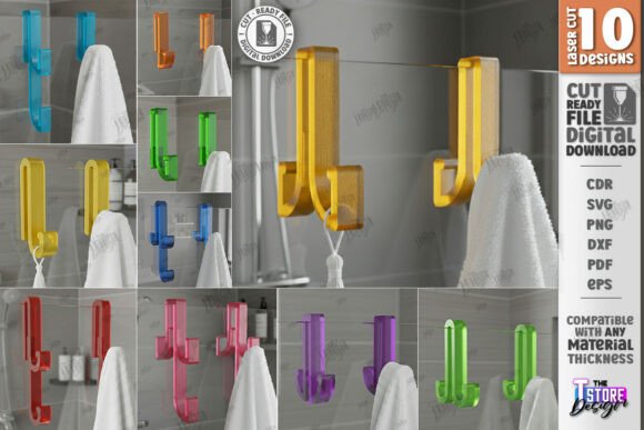 Archivos en SVG, DXF, EPS, PNG, PDF y CDR, compatibles con LightBurn, CorelDRAW, Illustrator y máquinas CNC de corte láser. Diseños perfectos para crear colgadores para puerta, organizadores para baño, ganchos para toallas y accesorios funcionales para el hogar.