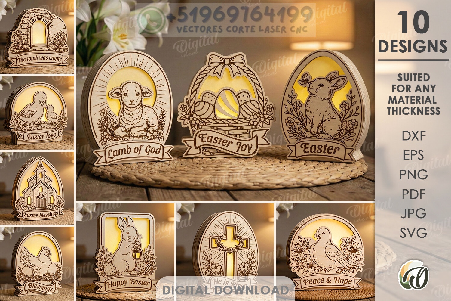 Pack de 10 lámparas 3D de Pascua para corte láser en MDF. Diseños en capas con efecto de profundidad, listos en DXF y SVG. Ideal para decoración y venta artesanal.