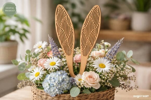Convierte una simple canasta en una pieza encantadora de temporada con este pack de orejas de conejo decorativas para corte láser, una colección diseñada para transformar arreglos florales, canastas o centros de mesa en auténticas decoraciones de Pascua.