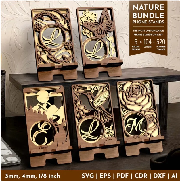 Sorprende con este exclusivo paquete de soportes para teléfono con diseños inspirados en la naturaleza y monogramas personalizables. Un proyecto perfecto para corte láser que combina elegancia, utilidad y personalización.