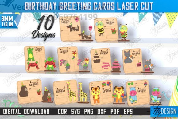 Sorprende en cada celebración con este adorable paquete de tarjetas de cumpleaños para corte láser, diseñado especialmente para niños y niñas. Cada tarjeta presenta personajes tiernos y detalles que podrás personalizar para darle un toque único.