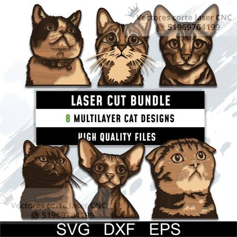 Un diseño perfecto para amantes de los gatos y del arte en madera. Este pack de gatos multicapa incluye varios retratos felinos con gran nivel de detalle, diseñados para crear piezas decorativas con efecto tridimensional.