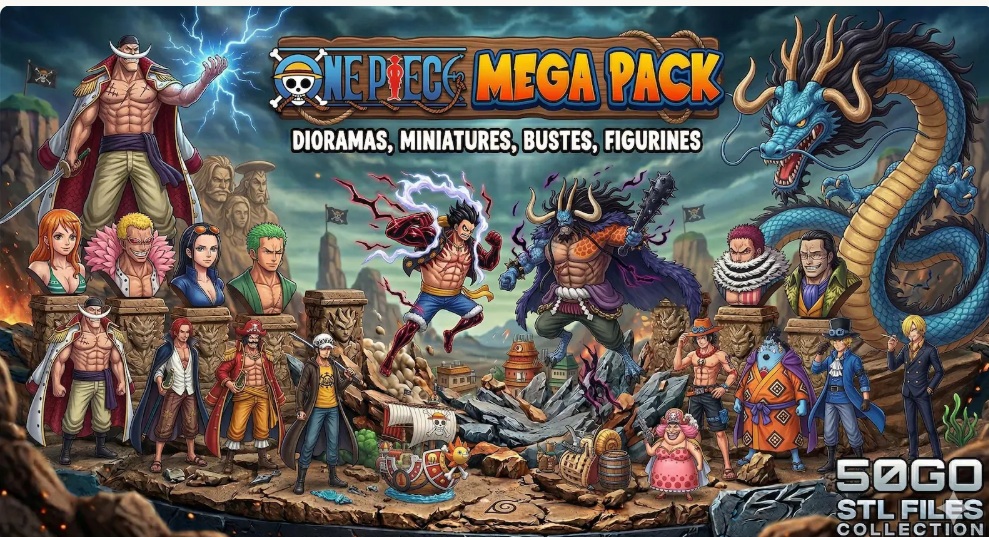 Este impresionante pack de modelos STL estilo anime reúne figuras, bustos y dioramas listos para imprimir, inspirados en mundos épicos llenos de acción, aventura y detalle.
