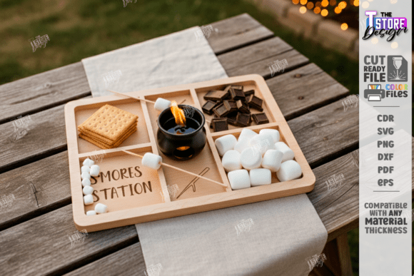 Son vectores digitales profesionales para corte láser, diseñados para fabricar bandejas organizadoras donde cada ingrediente tiene su lugar: malvaviscos, chocolate, galletas y utensilios. Todo ordenado, todo visible, todo listo para compartir.