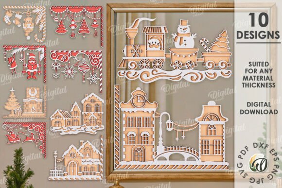 Incluye 10 diseños únicos: tren navideño, casas nevadas, adornos, Santa Claus, árboles y más.
