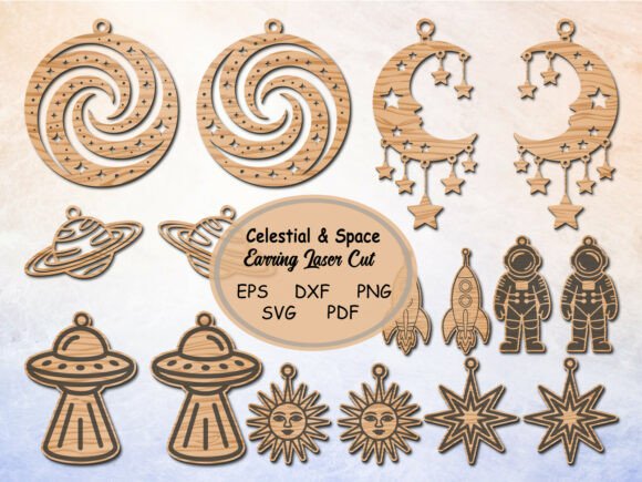 Descubre la magia del universo con este paquete de pendientes celestiales y espaciales para corte láser. Diseños únicos que incluyen planetas, astronautas, soles, lunas, estrellas y más, perfectos para crear accesorios originales y personalizados.
