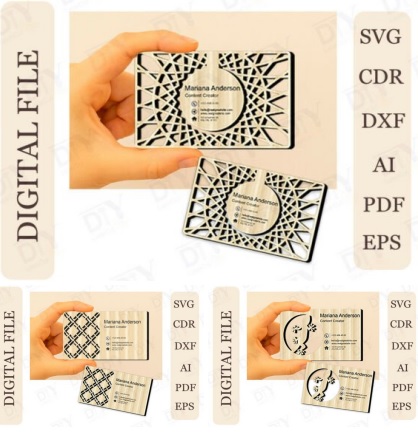 Destaca tu marca personal o negocio con estas exclusivas plantillas de tarjetas de presentación para corte láser. Cada diseño combina creatividad y elegancia, convirtiendo una simple tarjeta en una pieza única de presentación profesional.