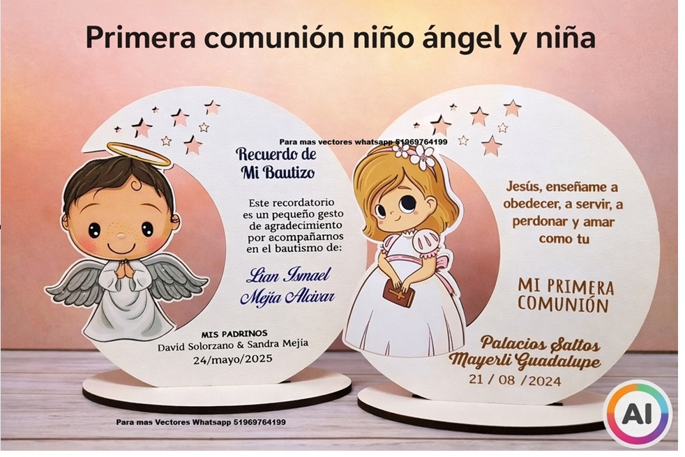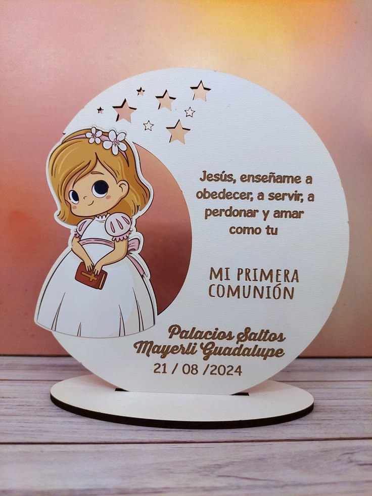 Este delicado recuerdo circular infantil ha sido diseñado para celebraciones llenas de significado como Primera Comunión y Bautizo, combinando ternura, simbolismo y un estilo moderno ideal para trabajos en madera, MDF o acrílico.