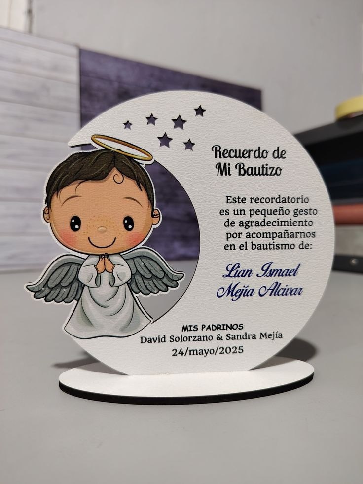 El diseño presenta figuras infantiles estilo angelical, con detalles suaves, estrellas decorativas y una composición circular equilibrada que transmite calma, fe y gratitud. Incluye espacio para nombre, fecha y mensaje personalizado, lo que lo convierte en un recuerdo único y emotivo para padrinos, familiares y invitados.