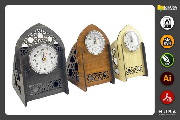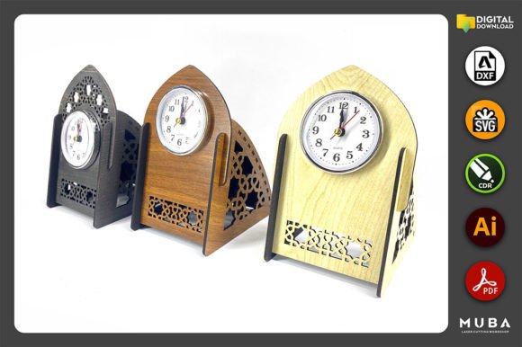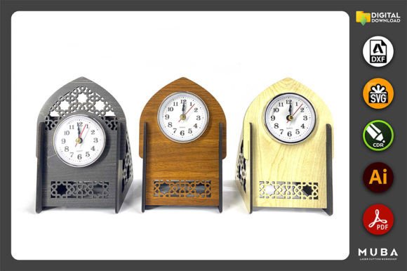 Este vector para corte láser te permitirá crear un reloj de escritorio artesanal, con un diseño refinado que combina precisión y estilo. Incluye tres modelos distintos, ideales para personalizar con diferentes tonos de madera o acabados.