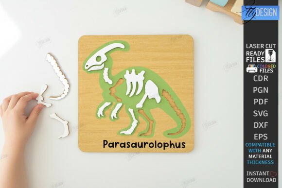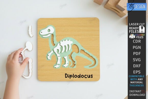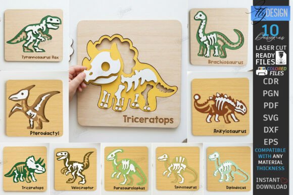 Cada diseño presenta un dinosaurio distinto con su estructura ósea simplificada, ideal para manos pequeñas y mentes inquietas. Las capas encajan con suavidad, el corte es limpio y el resultado final es tan decorativo como educativo. Perfecto para fabricar en madera o MDF, pensado para resistir uso real, no solo miradas.