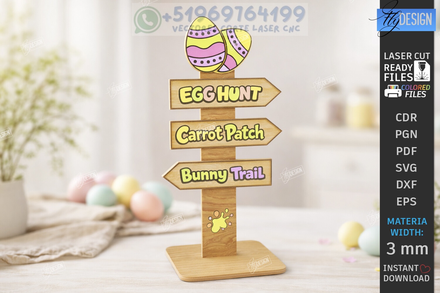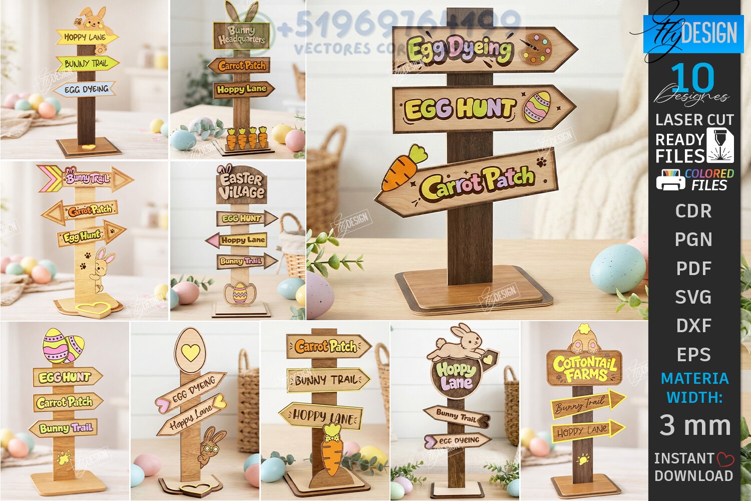 Pack de 10 señales direccionales de Pascua para corte láser en MDF 3 mm. Diseños en DXF y SVG listos para eventos, decoración y venta artesanal.