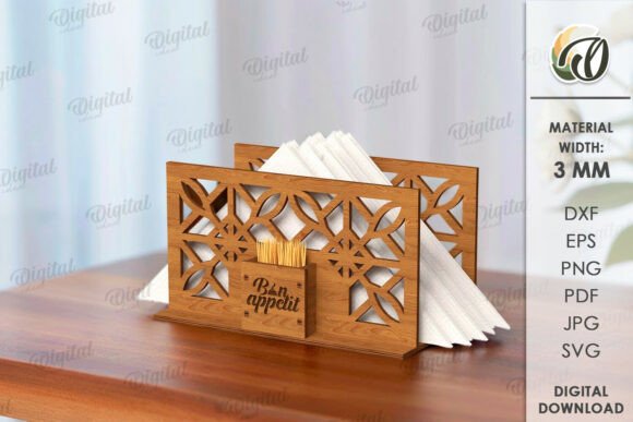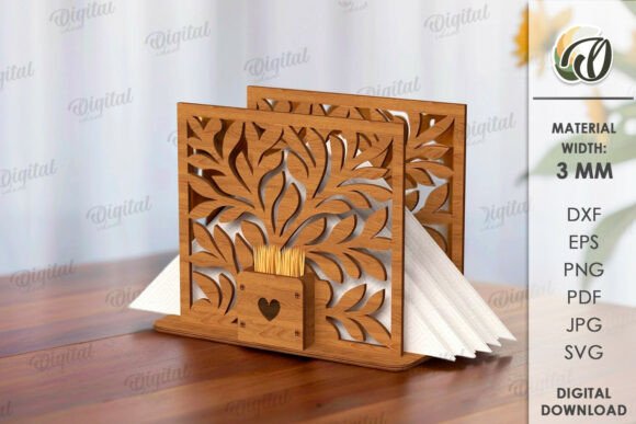Incluye 10 modelos distintos, con patrones geométricos, curvas ornamentales y diseños temáticos listos para corte y grabado láser o CNC. Cada pieza incluye espacio para servilletas y un práctico compartimento para palillos o mondadientes, manteniendo todo en orden y con un toque decorativo.