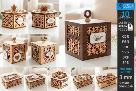 La colección incluye 10 modelos de cajas ornamentales, con patrones calados y detalles decorativos que combinan formas geométricas, corazones y motivos florales. Cada diseño permite fabricar una caja resistente y estética utilizando MDF de 3 mm, logrando piezas que destacan por su estilo artesanal.