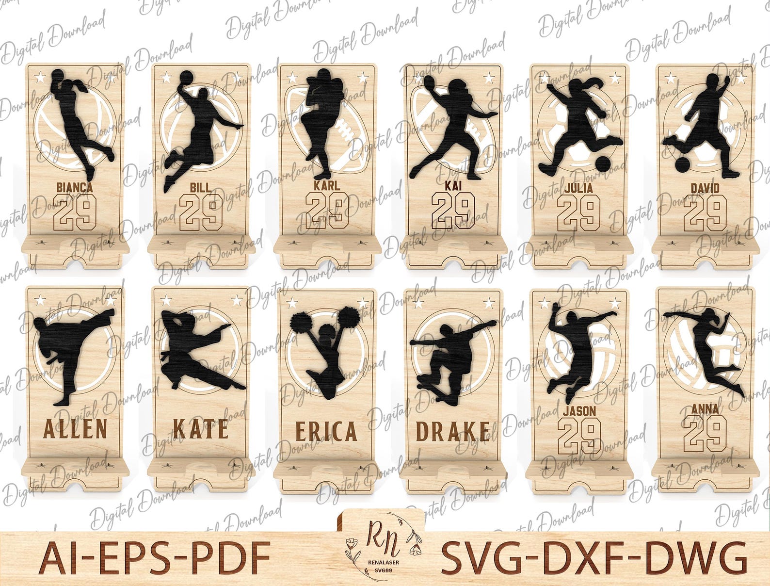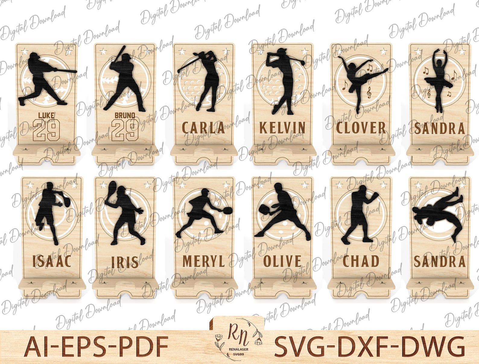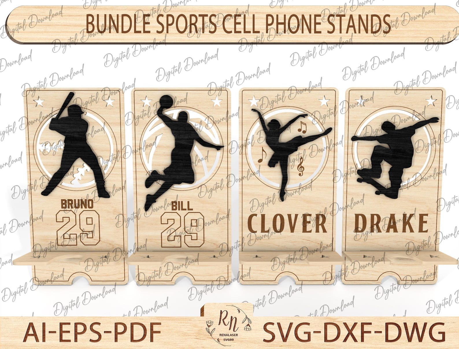 Un bundle versátil y altamente vendible de soportes para celular inspirados en el mundo del deporte y el movimiento. Diseños pensados para destacar en escritorios, mesas de noche o vitrinas, con un estilo moderno que conecta muy bien con regalos personalizados y ventas por encargo.